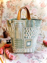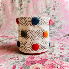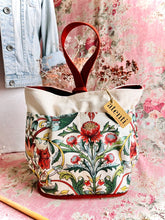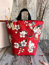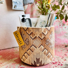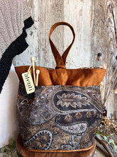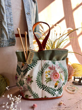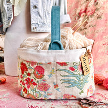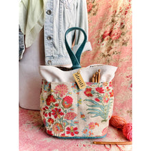 The Atenti Hope Basket- Neutral and natural print on a heavy stock. A roomy stand-alone project bag. Top rolls down for easy access. Wide opening and two handles. Fully lined in water our light tan water repellent taffeta. Inside are three pockets. 12" tall x 8" wide x 8" deep