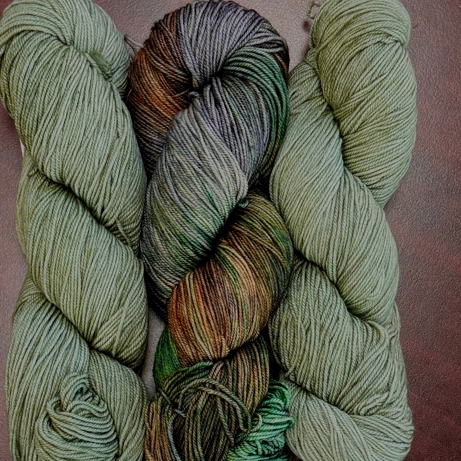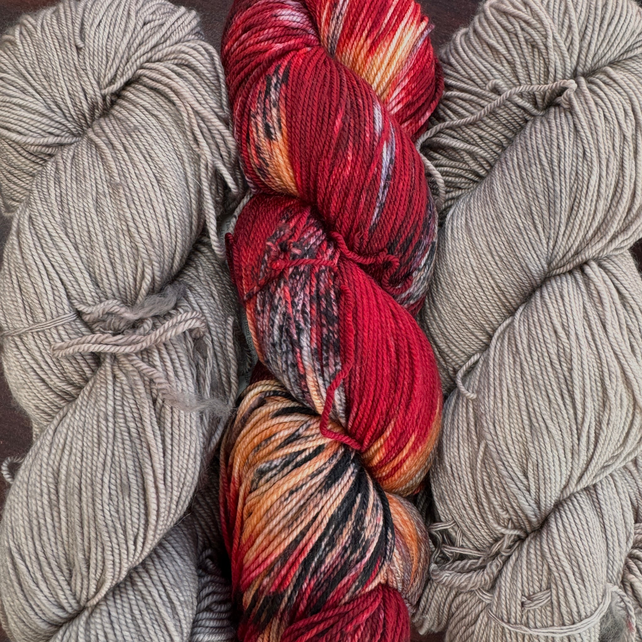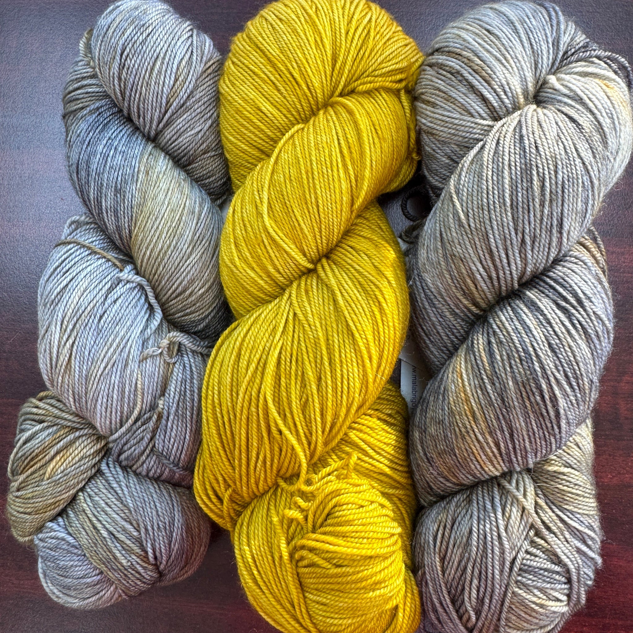 2 main color and 1 contrast color, 440 yds each for sock and 420 yards each for Mechita, 100g, fingering weight and free stitch stoppers with kit purchase.